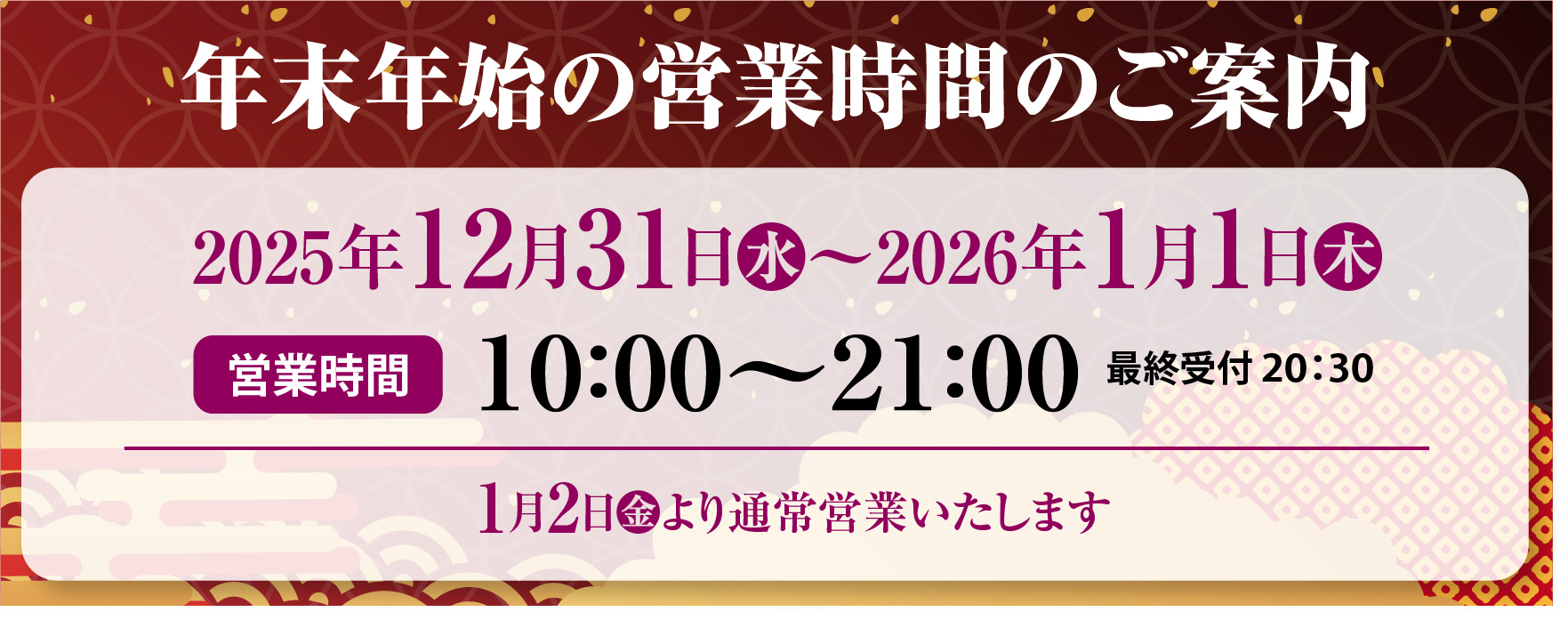 - 10:00〜21:30 最終受付
